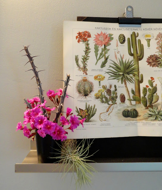 Since the bright pink reminded me of cactus flowers I stuck my (sadly) non-rooted Ocotillo cuttings in the vase too.