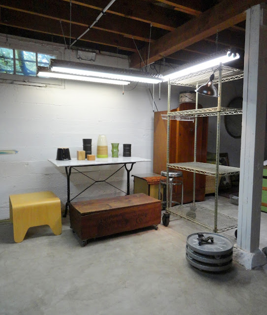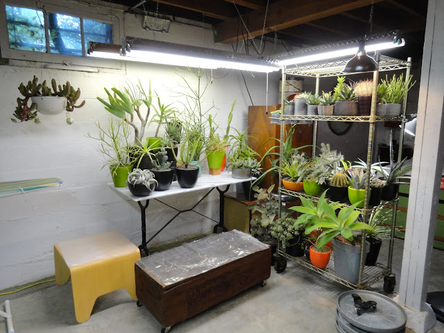 Here's the set-up in the basement, pre-plant invasion. The assortment of things on the table are to add height to the back row of plants, all the better to see them and for them to get the most light possible. The stack of metal circles in the lower right are platforms on wheels, for the especially large and heavy things.