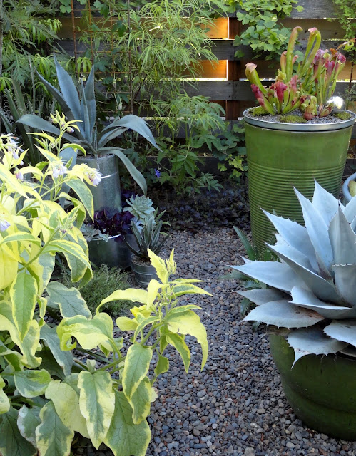 Jumping across the pathway now, to the stock-tank pond side...in the first "after" photo, at the beginning of this post, you may have caught a glimpse of a few brightly colored plants atop the tall green container. After years of a variegated Agave americana calling this spot home, I decided it was time for a change. A shallow metal dish (which some of you might call a trash can lid) was planted up with a collection of Sarracenia. I did line the lid with plastic first, just in case the galvanized metal was not agreeable to these (rumored to be sensitive) plants.