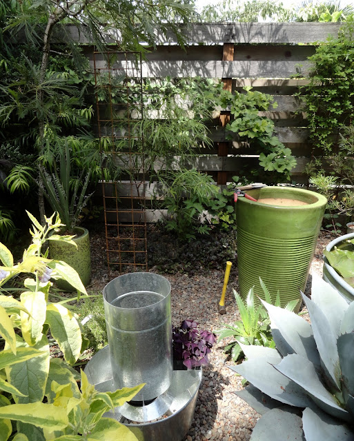 It's a wonder I like both of them as much as I do, their being spoilsports and all. I kept picturing an Agave here, but one up on a stage, of sorts. Then I found this cool metal vent thing at the Rebuilding Center. Yep, had to have it.