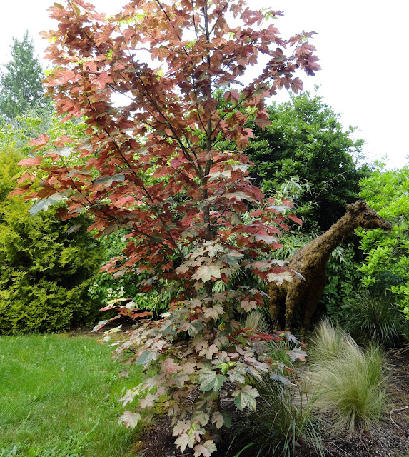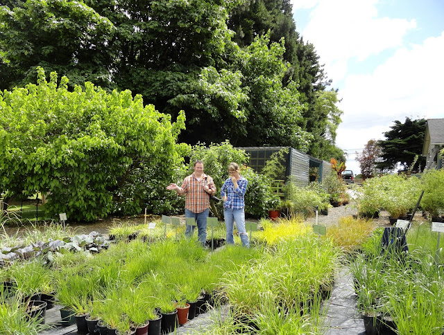 Are you wondering if I bought anything? I did, although since was just the day after I spent a pretty penny at Rare Plant Research I was on my best behavior. On the left is my Wind Dancer purchase, Stipa arundinacea 'Sirocco' and on the right a Pennisetum purpureum 'Vertigo' picked up at Portland Nursery on my way home. I'd admired it last year in Scott's garden and he'd mentioned they were available there.
