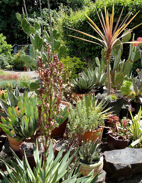 She loves spikes too! And there is definitely a design idea here to steal; the raised bed stair-stepped up and visible from all sides is a magnificent way to display prized plants like these in containers.