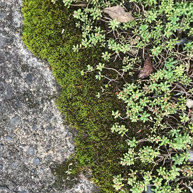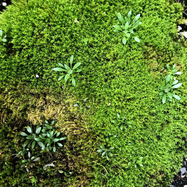 This patch of moss has been growing in one of our driveway stock tanks, since I rescued it off a sidewalk. I'm sure the little seedlings are weeds, but right now they're awfully cute.