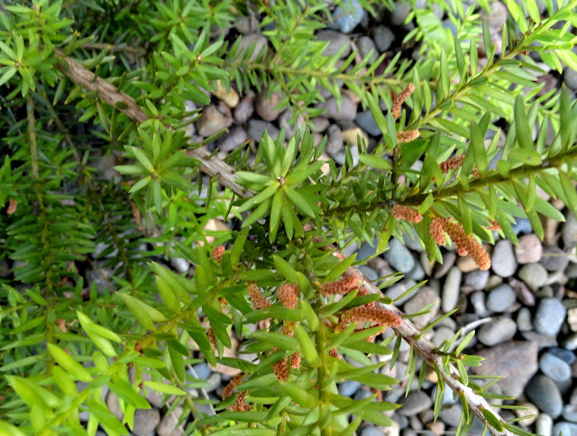 Obviously I ignored that 8ft tall x 6ft wide part (what else is new), and maybe I'll be okay because Far Reaches Farm says it will only get to be 3ft x 3ft. Their description: "One of the fine hybrids (P. lawrencei x P. nivalis) from New Zealand's County Park Nursery. This hardy dwarf conifer has orange new growth maturing to green and a subtle bronzing to the foliage in winter. Trying hard to think if there is anything tricky about this or if it is just going to be a care-free easy plant.............nope - it's easy! Just don't let it get real dry."
