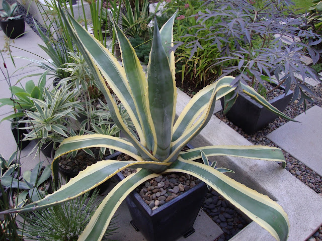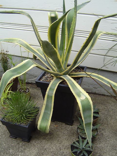 Who's Mr. Big? My oldest agave, a variegated Agave Americana that I bought at Rare Plant Research back in 2006 or 2007 (record keeping pre-blog is a little hazy). That's him on the right, in his new container.