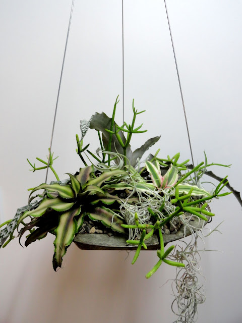 The debut version of my hanging vintage pie plate appeared in the garden back in 2016. Inspired by a trip to Lotusland, I put it together to highlight a few bromeliads. Here's what it looked like then...I never really loved that creation, there were too many elements. The plants felt secondary to the hanging structure and that is never my goal. The next iteration was better, much better. Here it is shortly after I put it together, still in the basement, as it was too early in the season for these plants to go outside...