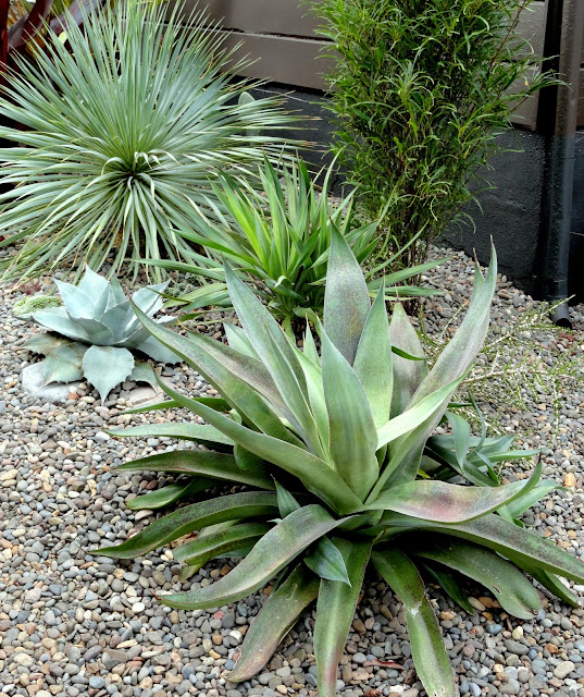 I’ve grown a couple of x Mangave 'Macho Mocha' in containers and never loved them as much as I did the day I brought them home. Their fleshy leaves are easy to break and they just never looked great. Spring of 2012 I stuck this one in the ground, partially because I needed its container for something else and partially because I was just done with it. I never thought it would live through that winter, but it did. And now, well…it’s gorgeous! (those silver and blue metal uprights are part of my neighbors avant-garde fence)