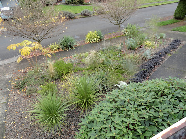 Here he’s captured the front garden, all but the large planting area against the house where the Bishop’s Weed used to be (on the right side of the sidewalk where you can't see). The space is actually a little bit larger than it looks, since the slope down to the street is all but lost from this angle.