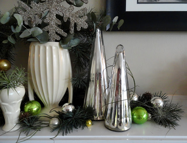 See I got obsessed with another idea…the mix of natural with fake sparkle. Like fancy ribbon tied on brown kraft paper, seed pods combined with glitter, and an aluminum Christmas tree with eucalyptus branches. Yes I know, odd.