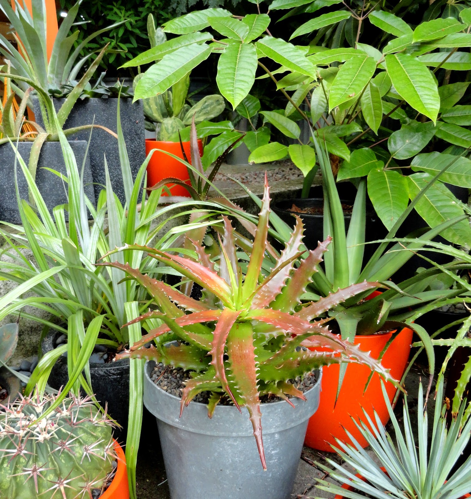 So what makes this plant special? It colors up dramatically, in fact its common name is sunset aloe. This one’s my oldest, in a (rare for me) combo container on the patio table.