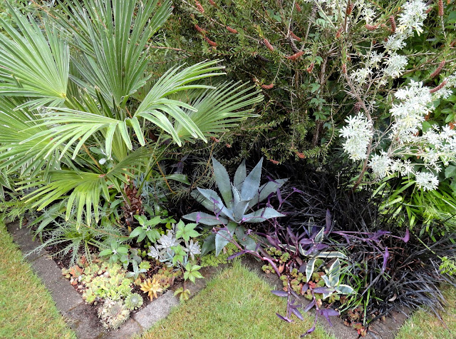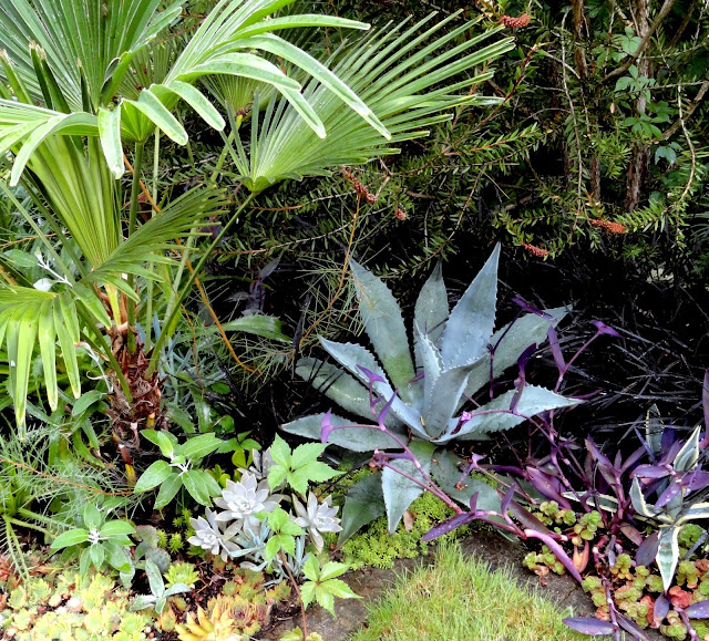 I had no plans to post for this Wednesday's Vignette meme, but walking through the garden after an early morning shower had me seeing the colors of this corner in a different way. The blue agave (unknown species, a "pup" gift from my Arizona brother years ago) simply had to have it's photo taken.