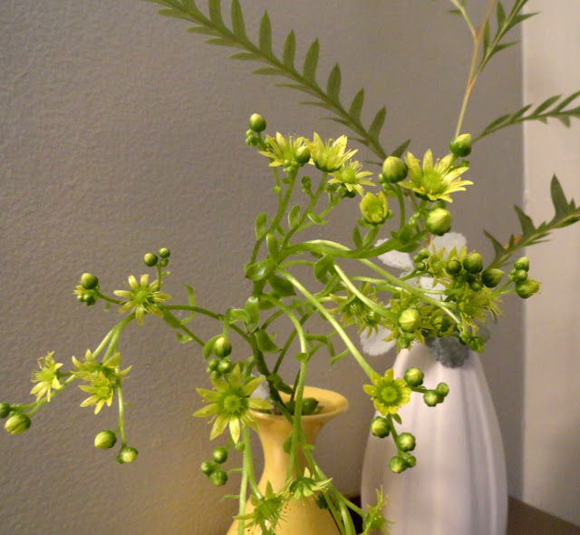 Oh! But wait. Inside the house we have a bunch of Aeonium flowers, in a vase because the bloomspike got so tall it was causing the rest of the plant to tip over.