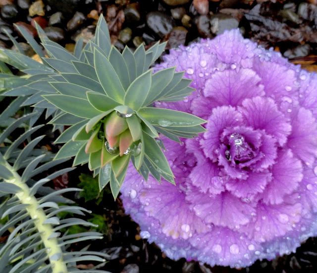 Euphorbia rigida is a few weeks away from flower, however the purple ornamental kale (left over from the OC&K Challenge) is doing it's best to make sure nobody notices.