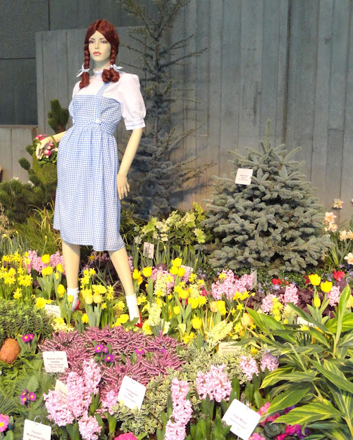 By my count there were 21 display gardens at the NWFG show, and that’s not counting this one at the entry, which obviously pays homage to the Wizard of Oz, Seattle’s nickname “The Emerald City” and the theme for the show “Gardens Go Hollywood” (has the Tin Man ever looked like more of a dude? And what’s with that pose Dorothy is striking?).