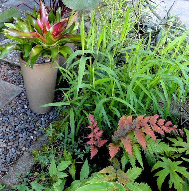 On the left is a new-to-me NOID Bromeliad, on the right is Woodwardia unigemmata. I am quite obsessed with this fern that puts out new growth in shades of red. Isn't it fabulous!?