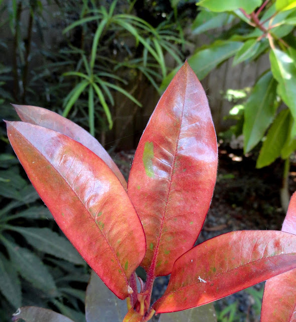 And the new growth on my Rhododendron 'Ebony Pearl'...decidedly red, which will fade to a dark purple with time (zones 6-9, part shade, even moisture).
