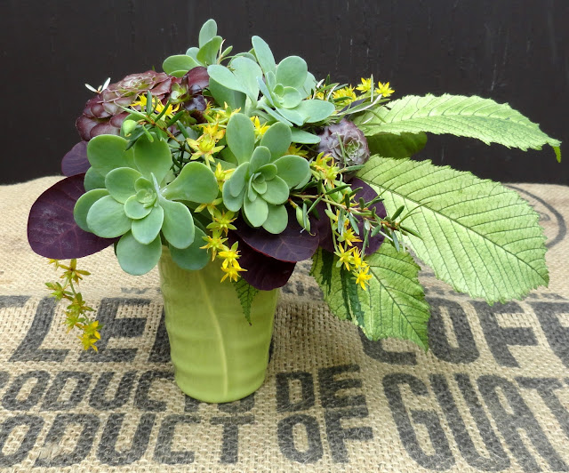 Since it's Monday, and these are vases created from things in my garden, I'm also linking up with Cathy and her meme In a Vase on Monday. Click on over there to see what other gardeners have cut and arranged from their gardens (I wonder if there will be any Aeoniums?).