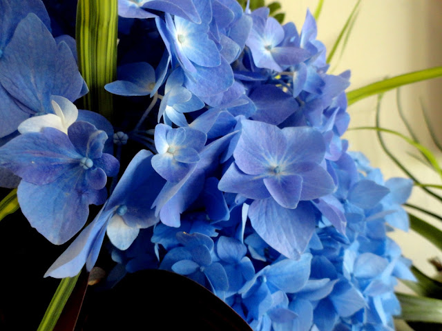Oh that my Parahebe perfoliata was still blooming! But it's not. So I set out looking for something in blue. Finally I settled on the Hydrangea next to our driveway, technically belonging to the neighbor. However since I've kept them alive (just barely) by watering them over the last few summers I do feel some sense of ownership.