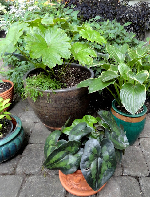 Holy Big Leaves! Look at the size of the leaves on that Asarum (no clue which one it is). If I ever find one with leaves that large I'll definitely grow it in a container – so the slugs don't make it dinner.