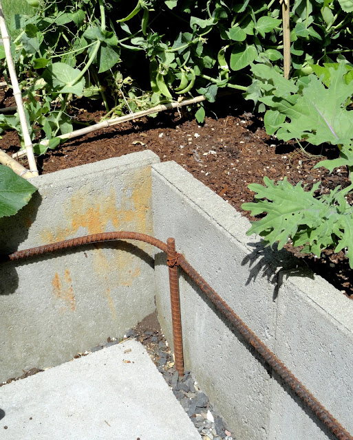 In another garden (the King garden) I spied a very inventive way to create a raised bed. Cement pavers and rebar!