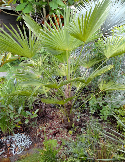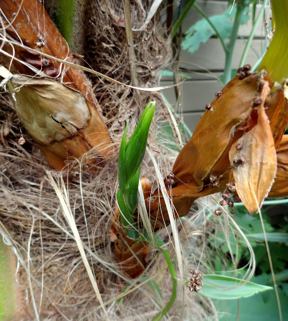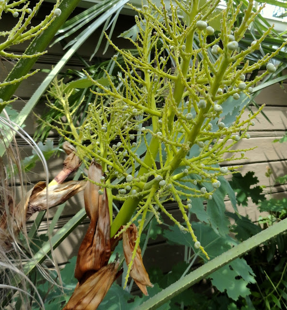 And look! There are even "berries" forming on the Trachycarpus bloom skeletons.