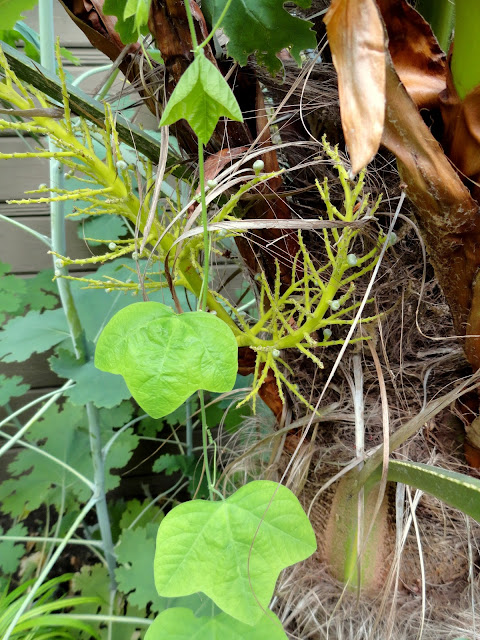 No blooms yet, but it's definitely taking advange of all the material for gripping. On the right is an orange blooming Bomarea shared by a friend. His plant has been sort of secured (tied) to a palm trunk, mine is willingly growing up through the fibers.