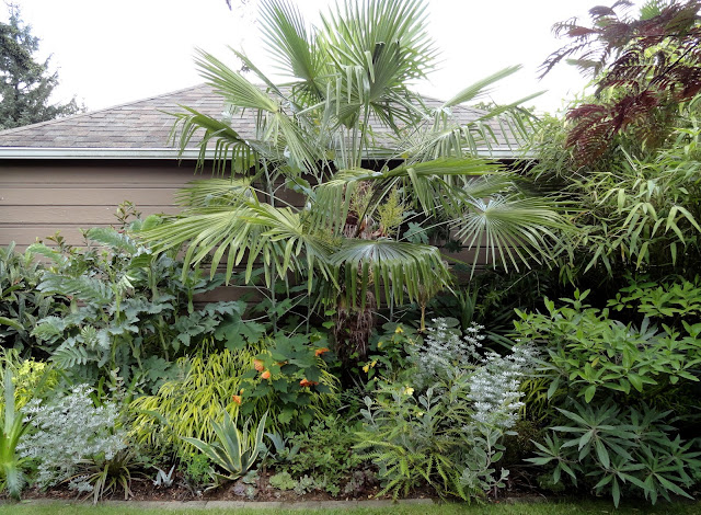 I'm trying to get this Trachycarpus wagneriensis in on the fun, with a small Passiflora rovirosae at it's base.