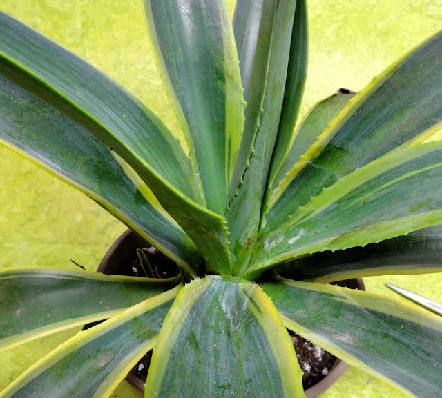 I really like the deeper colors this particular Agave desmettiana variegata has taken on.