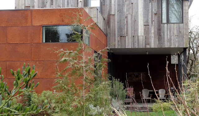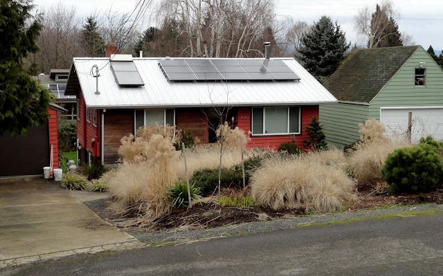 Whoa! Now for something totally different. This house is in-between the two matchy solar panel houses shown above. As I stood there staring in awe I realized this was vaguely familiar. Oh yes! It's the SIPs House (click on the link and you can see pictures of inside the house too). Love the design, but it's too bad about the tarp on the roof. That's not a good sign. At least it kind of blends and isn't screaming blue.