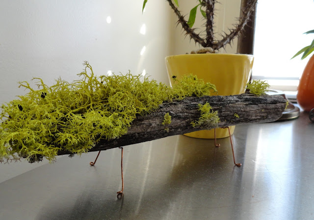 My plant lust partner Megan brought back this fluorescent reindeer-moss covered stick from a trip to Central Oregon, Andrew added the legs.
