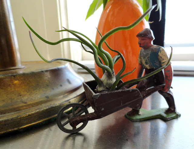 Looking at the things around the vase…this old metal toy and tillandsia were part of a Happy Anniversary diorama from Andrew, the wheelbarrow wheel really turns!